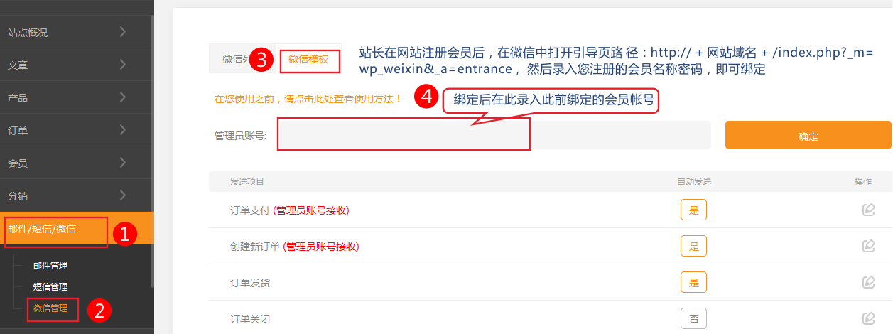 网站用户绑定微信后,可以使用微信接收订单提醒信息或找回密码验证码!此功能必须是认证后的服务号才能使用!