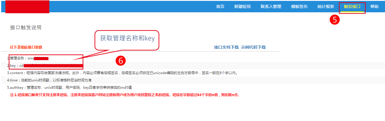 4. 回到网站管理后台点击 邮件/短信-》短信发送设置-》录入之前获取的管理名称、key值、密码和签名